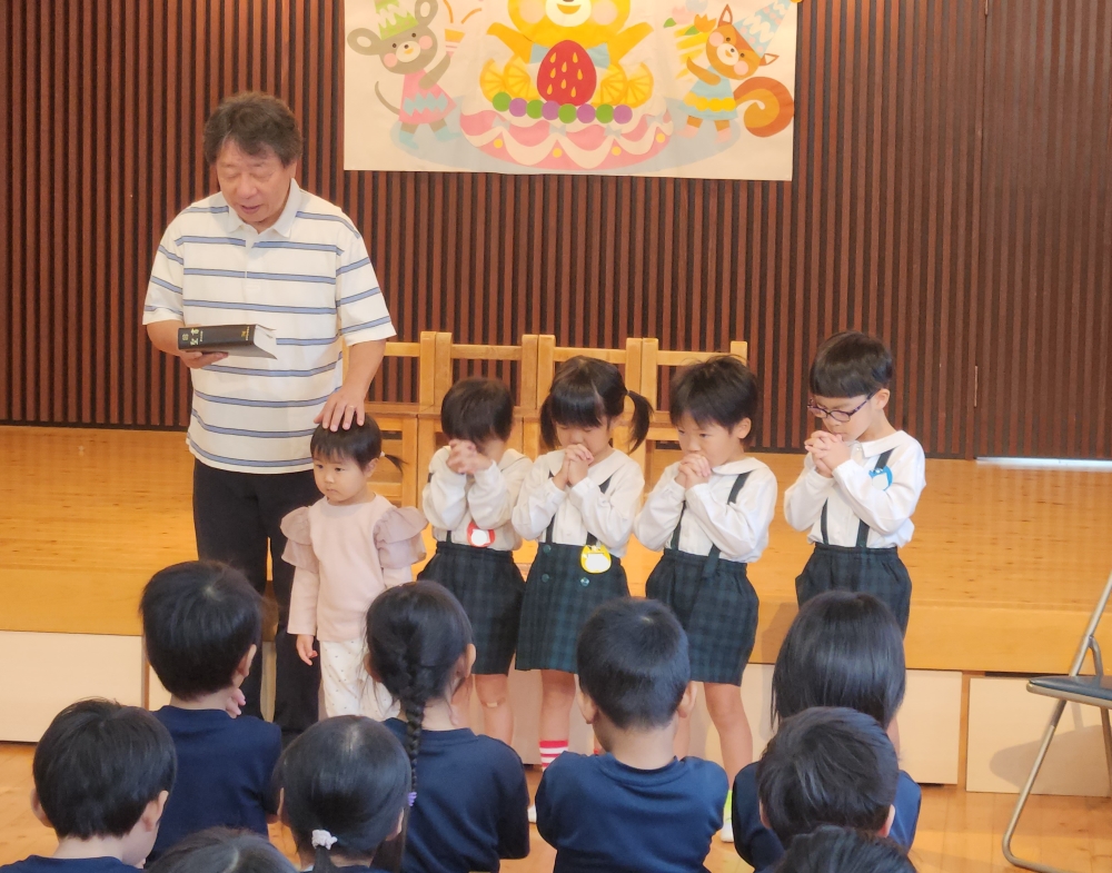 今日は10月生まれのお友達の誕生会でした。5人の子ども達が健やかに育つことを願い、徳渕牧師先生にお祈りを頂きました。