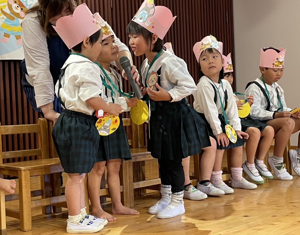 ことり組の誕生者3名が、マイクに向かって一緒に歌を歌ってるところです。面白く、ほほえましい写真ですね。